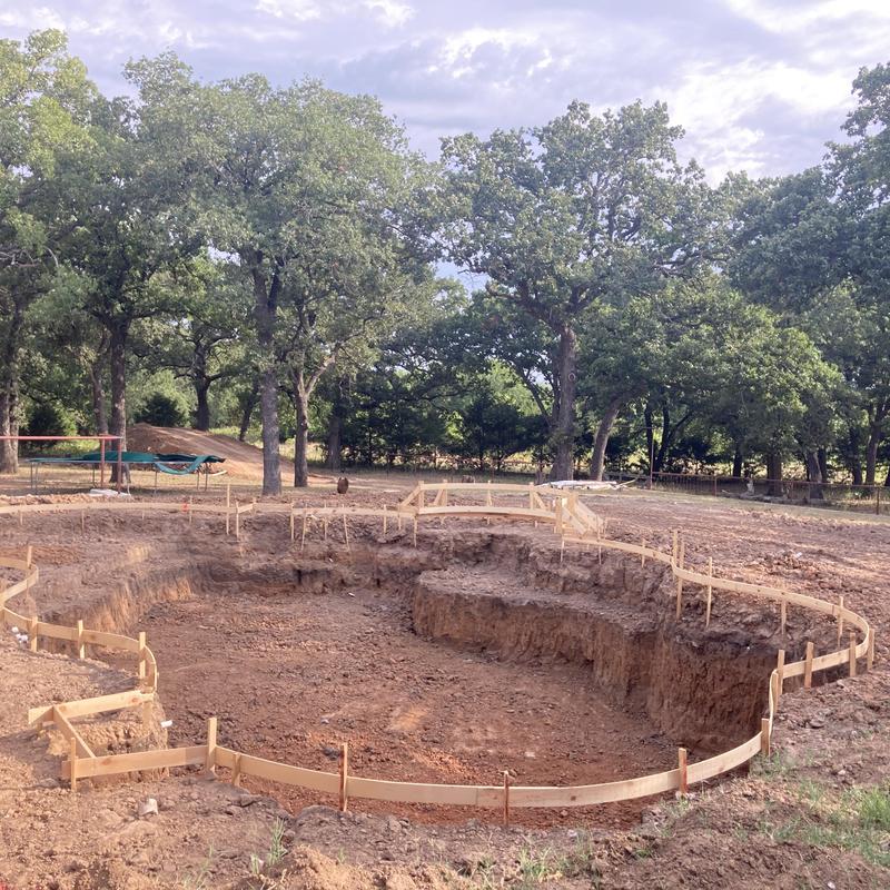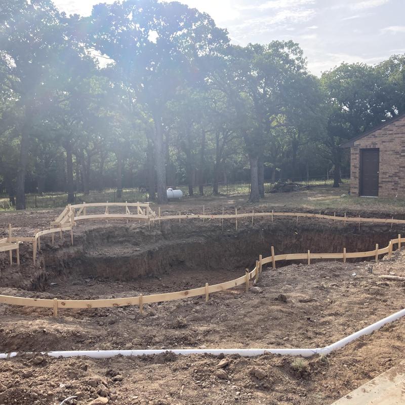 J Caldwell Custom Pools began pool excavation in Decatur, Texas. The team used excavation equipment to dig the site and prepare the ground for a new custom swimming pool installation. This phase marks the start of the construction process and establishes the layout for plumbing, framing, and future pool features.