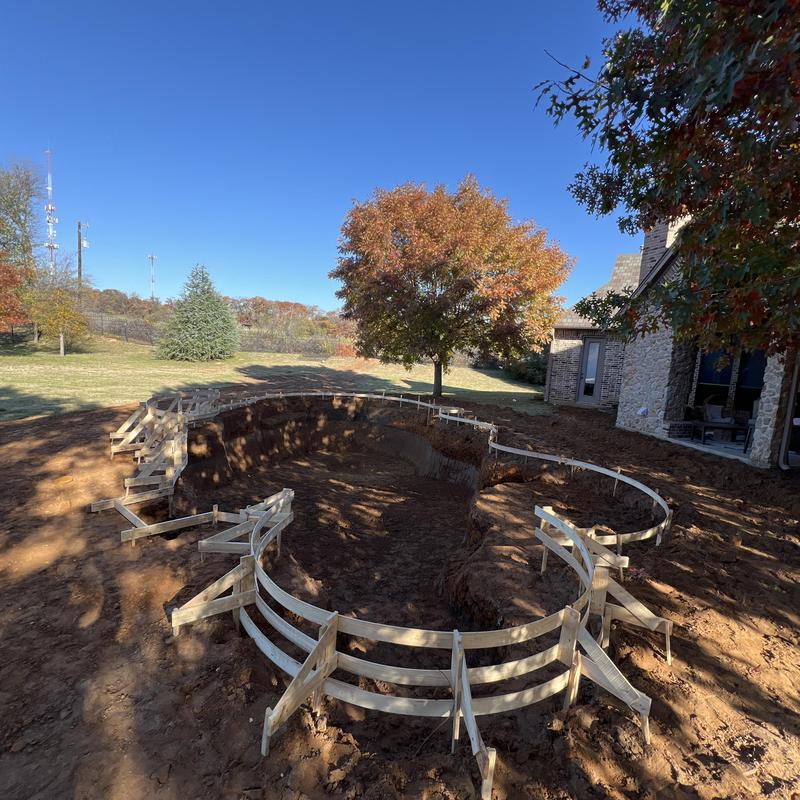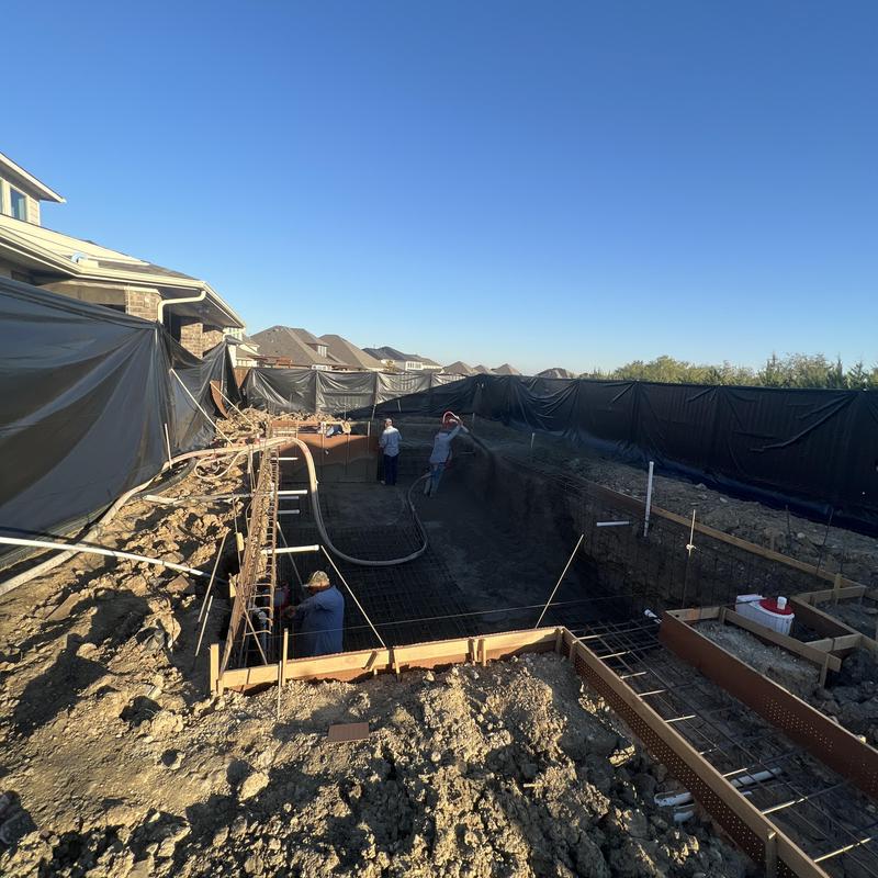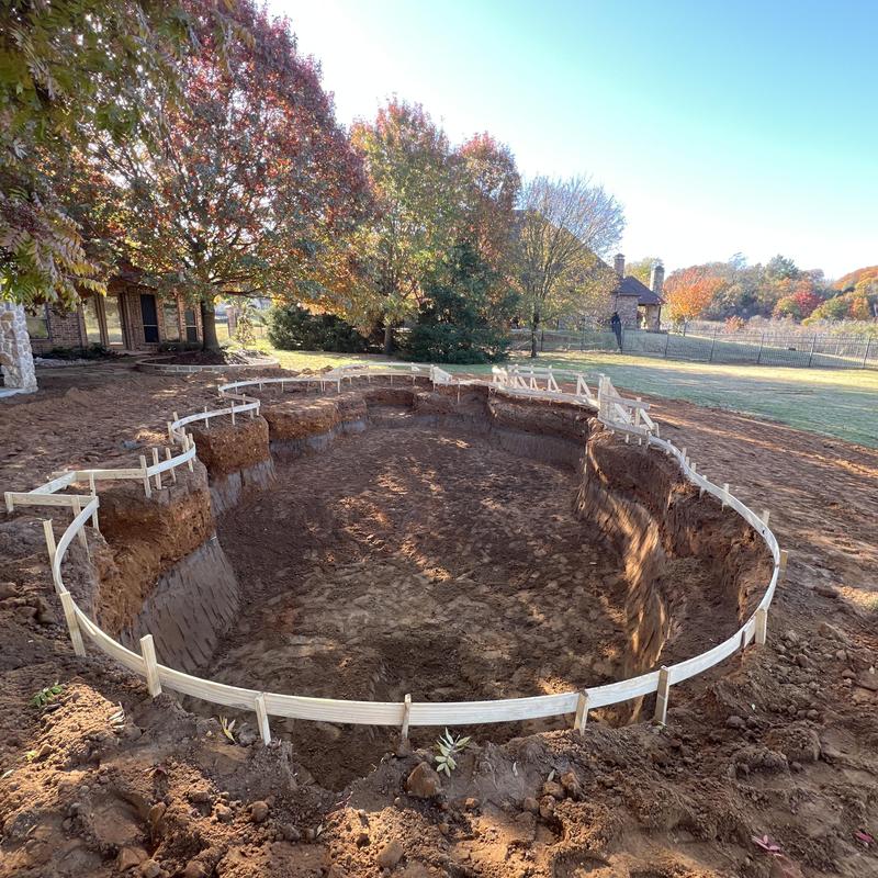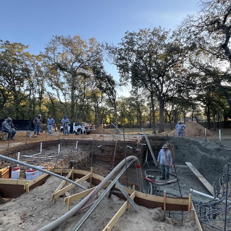 J Caldwell Custom Pools began pool excavation for a residential project in Trophy Club, Texas. The team used excavation equipment to dig the site, starting the first phase of new swimming pool construction. This step shapes the pool layout and prepares the area for structural framing and plumbing.