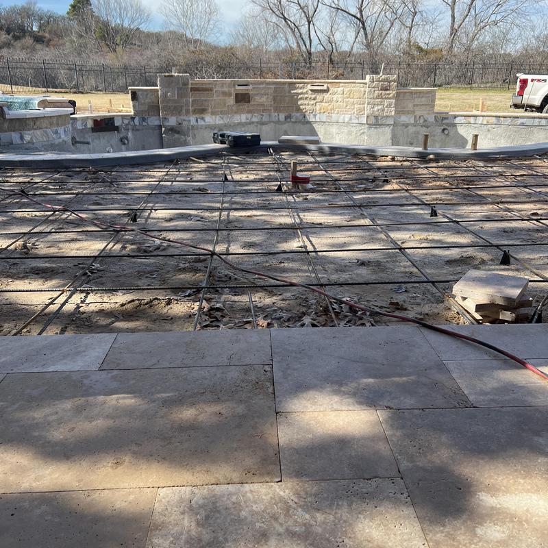 J Caldwell Custom Pools prepared a deck for concrete pouring using walnut and travertine materials in a patterned layout. The team completed this pool deck setup in Haslet, Texas.