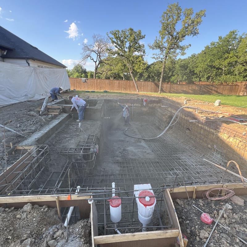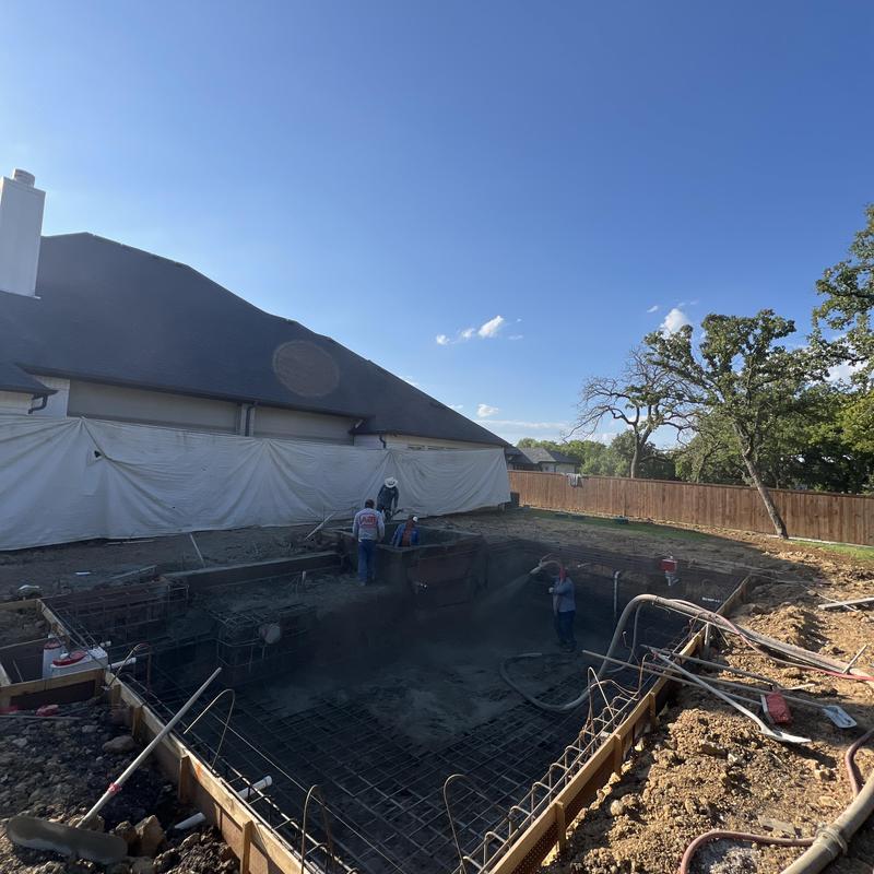 J Caldwell Custom Pools completed gunite installation for a custom swimming pool in Keller, Texas. The crew applied the concrete shell, forming the pool’s structure. The process progressed smoothly with no weather disruptions. This stage marked a key step in shaping the final pool design and preparing for upcoming construction phases.