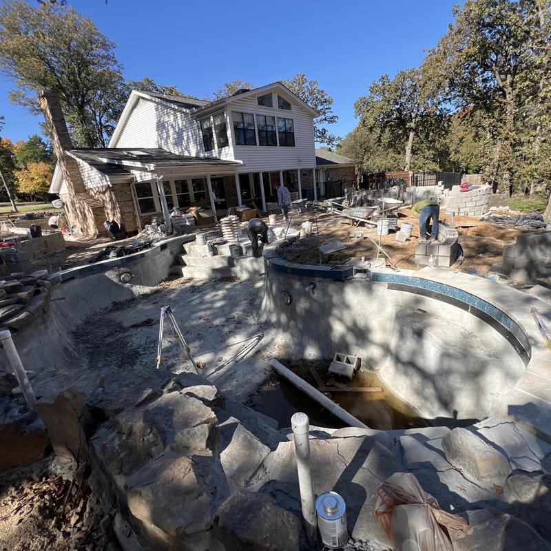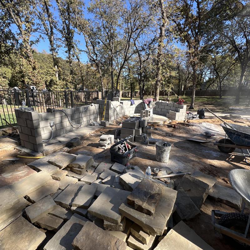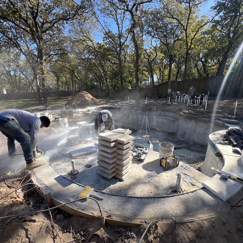 J Caldwell Custom Pools completed stonework for a pool project in Keller, Texas. The team shaped and assembled stone elements to build the structure of the feature. This stage focuses on forming the foundation for later installations, such as water features or decking.